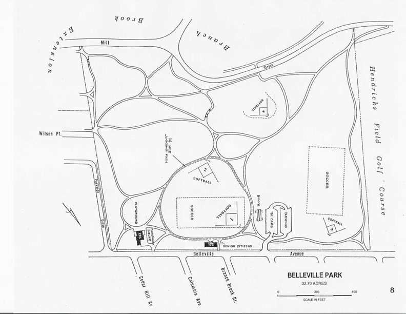The Belleville Park is a mid-sized, 32.70-acre park of wooded greenery bordered by Belleville and Parkside Avenues and Mill Street along the Second River, which was once a part of the Morris Canal. The park forms an extension of Branch Brook Park, creating a continuous green strip over 2½ miles long. Some of Branch Brook's famous "Cherry Blossom Land" overflows into this park. Also adjacent to the park is Hendricks Field Golf Course, extending the green landscape further northward.