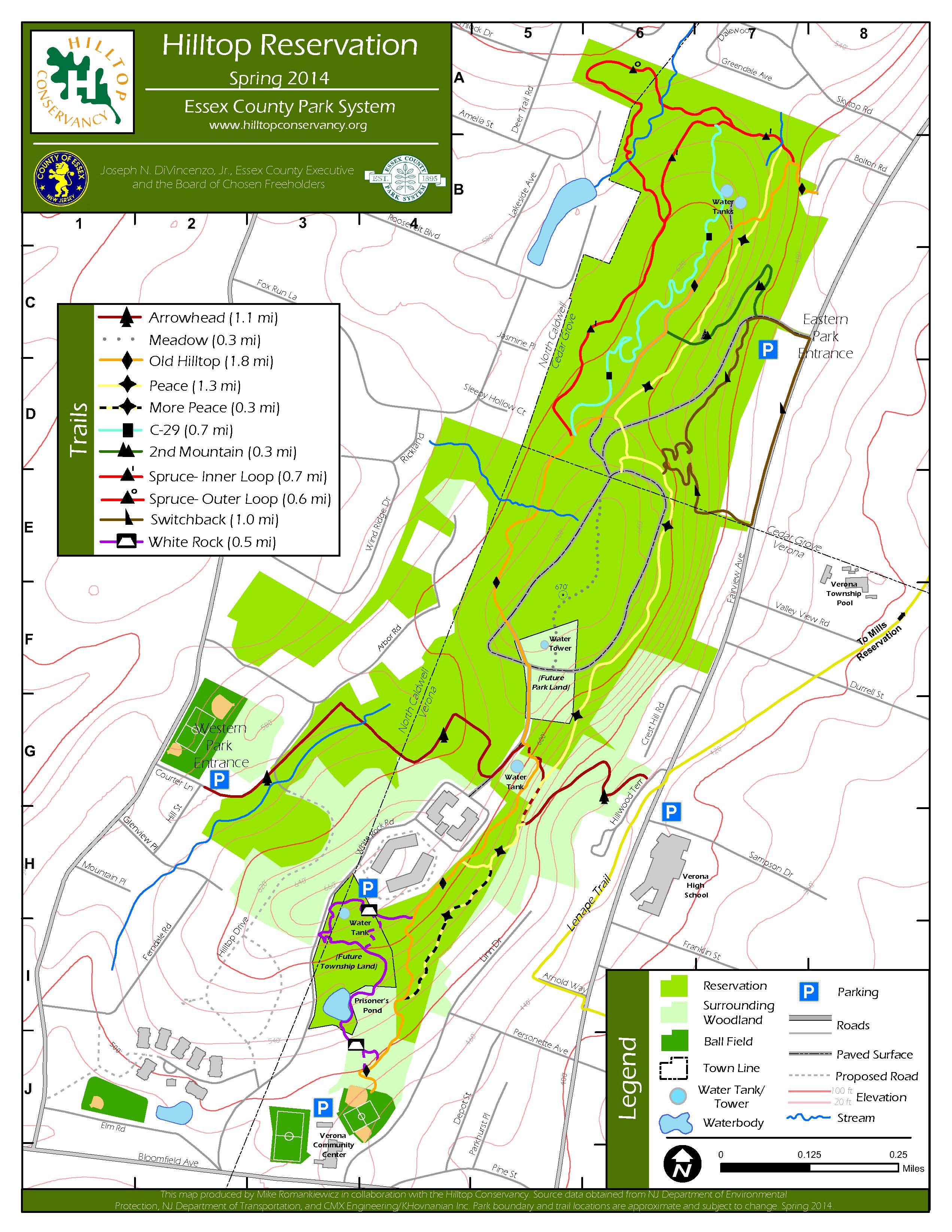 Hilltop Reservation is a recent addition to the Park System. It is composed of lands formerly included in the grounds of the Essex County Hospital Center. The land was designated a Conservation Easement in 2001, by the New Jersey Department of Environmental Protection, permanently dedicating it for conservation and recreation purposes, and thereby protecting it from any future development.