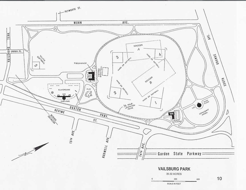 Vailsburg Park is located on 30.32 acres of land in the eastern section of Essex County off Oraton Parkway and South Orange Avenue, running alongside the Garden State Parkway. A mid-sized park heavily used primarily by neighborhood residents, it lies within the Vailsburg area of Newark and is the tenth largest park within the county park system.