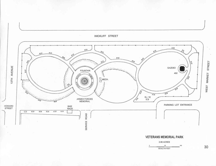 Essex County Veterans Memorial Park is bounded by West Market Street, Howard Street, 13th Avenue and Wickliffe Street. Two small meadow areas abut both sides of the Armed Forces Memorial, walking paths transverse the park and decorative metal archways highlight the entrances on Howard and West Market Streets. The entrances are further enhanced by landscaping and ornamental brick pavers. Near the West Market Street entrance is a gazebo with a copper roof topped by an ornamental clock.
