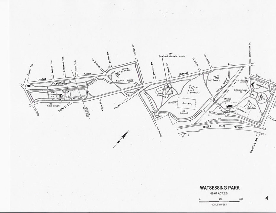 Watsessing Park is an Olmsted designed landscape located in Bloomfield and East Orange. This 69 acre park boasts a variety of athletic fields, a bandstand, basketball courts, and a senior citizens building.