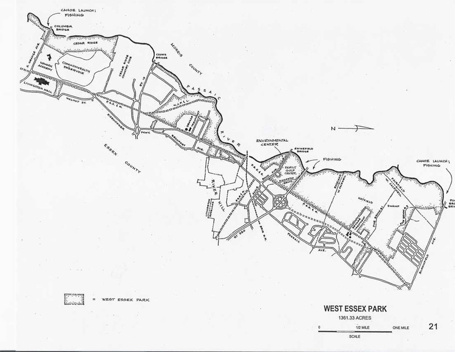 The West Essex Park is 1,360 acres of wetlands preserve which remains almost entirely undeveloped. It stretches along six miles of the Passaic River, starting at Bloomfield Avenue in Fairfield, and ending just beyond South Orange Avenue in Livingston.