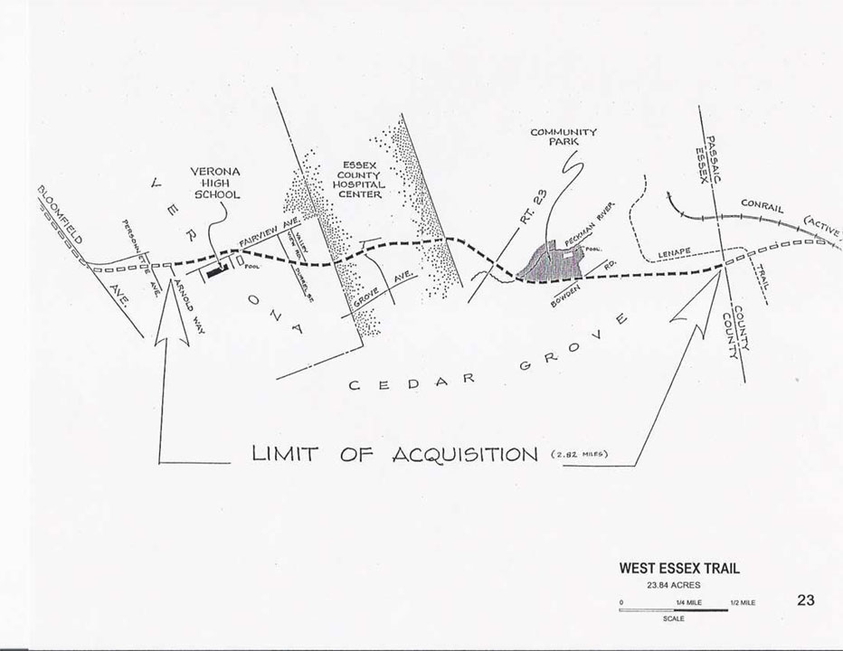 Acquired in 1985 through Green Acre funding, the 2.84 mile trail runs from Arnold Way in Verona, northeast to the Passaic County line. It crosses over Route 23 and the Peckman River and passes along Cedar Grove Community Park. The primary access to the trail is from Fairview Avenue, near Verona High School.