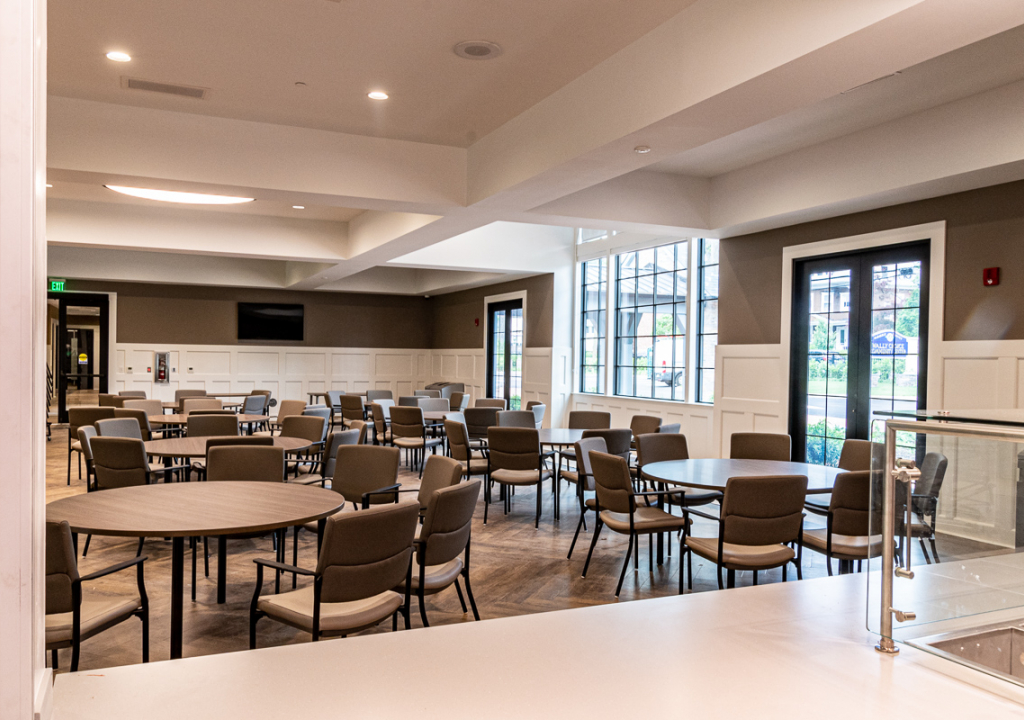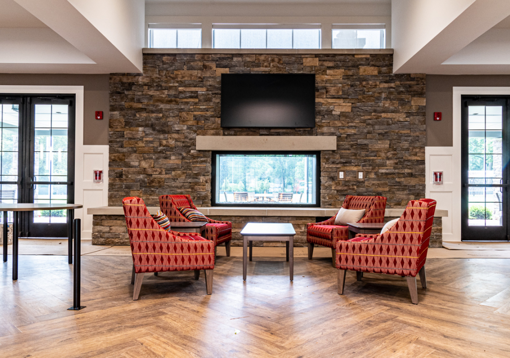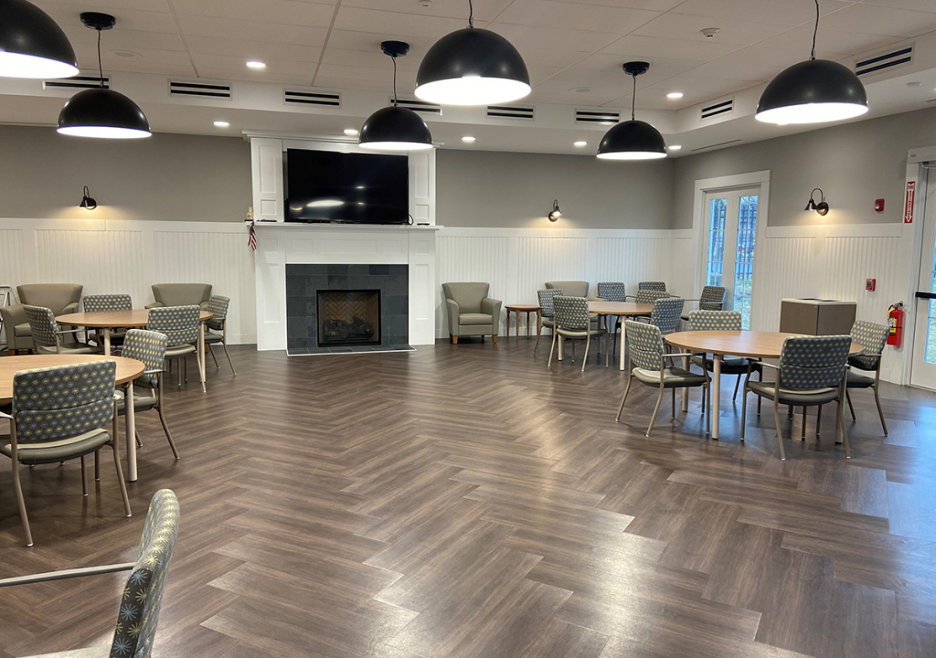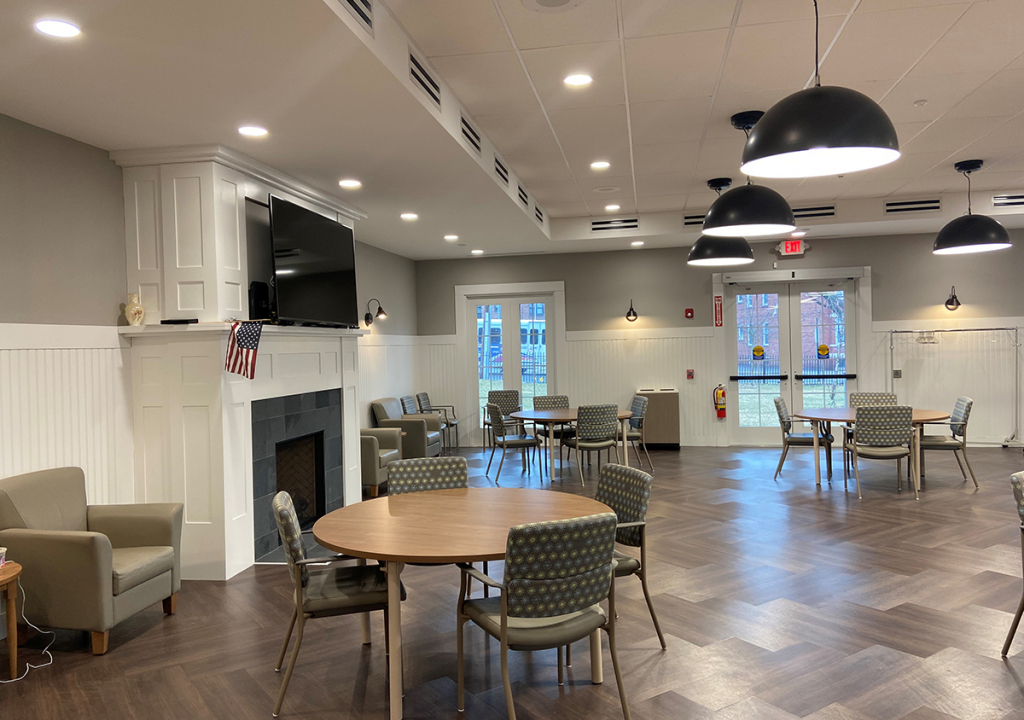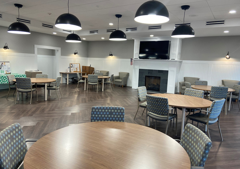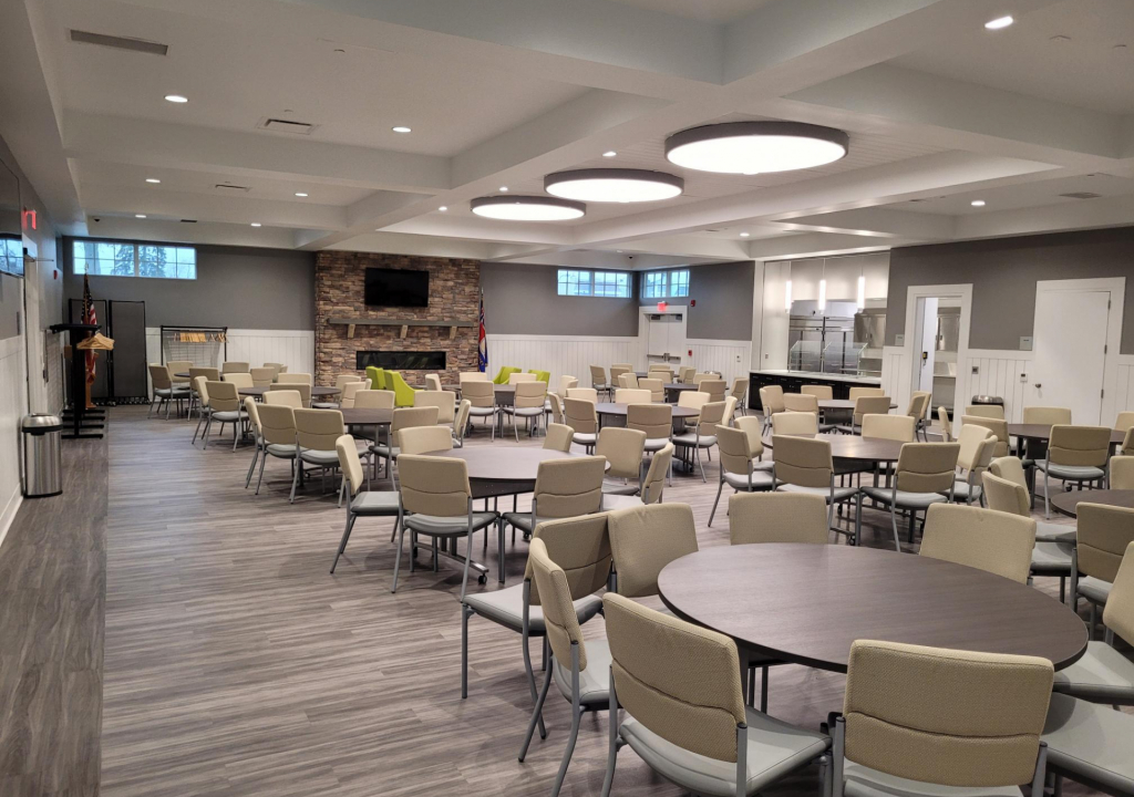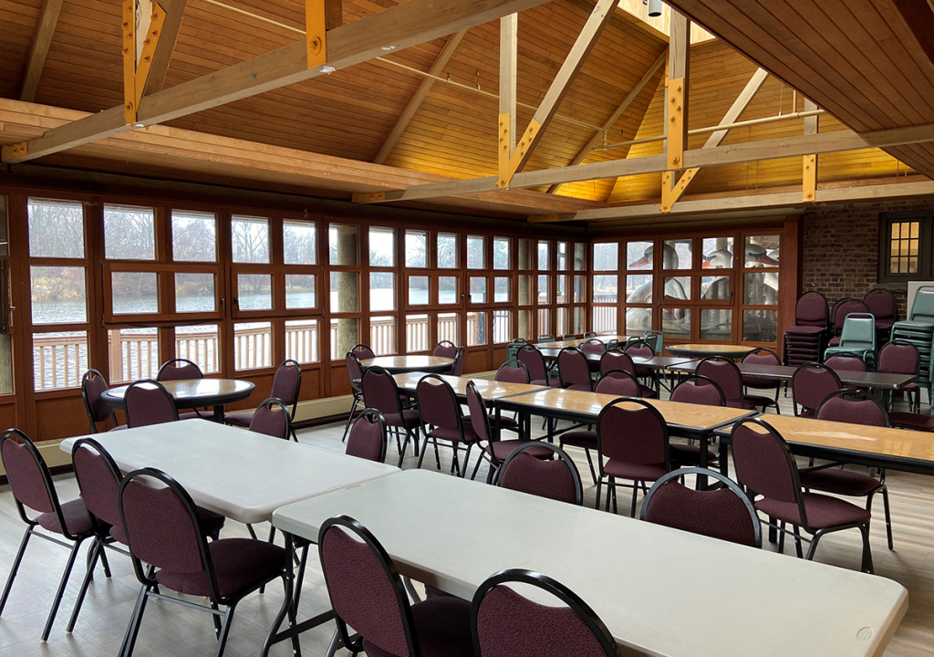 The Feldman Middleton, Jr. Community Center in Weequahic Park was re-dedicated following a complete rebuild in 2021. The brand new community center features a faux gas fireplace, two televisions and round tables with seating. Floor to ceiling windows look out onto the park. Double doors open onto a patio with outdoor seating and colorful umbrellas. Capacity for this room is limited to 100 people.